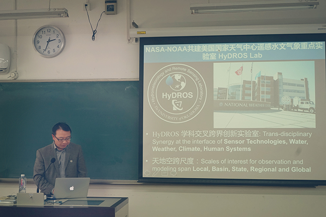 随后,洪阳教授以“全球水循环和遥感大数据”为题,对全球化的遥感水文和遥感大数据的发展以及对水循环研究的促进作用进行了回顾,报告的内容主要从数据的观测、模拟和预测三个方面依次展开。洪阳教授首先从遥感水文学的概念与发展历程出发,介绍了当前全球相关卫星服役情况及相关产品,同时,洪阳教授还结合清华大学HydroSky创新团队前期研究成果,生动地向同学们展示了作为理解全球变化重要因子以及影响人类社会发展的关键自然要素的降水、蒸散发、径流、土壤湿度、冰川湖泊、地下水储量等的长期定量反演数据产品,该团队所研发的数据产品不仅具有高时间分辨率还兼备颇高的空间分辨率,在国际上引起了强烈的反响。接着,洪阳教授简要介绍了所在团队前期研发的分布式全球水文模型CREST(Coupled Routing and Excess STorage)及其相关研究成果,通过该模型获取的全球分布式流域地貌学变量数据集也获得了广泛认可。分布式全球水文模型CREST还实现了与美国暴雨山洪泥石流灾害链模拟模型进行了耦合,形成了全球分布式水文-山洪耦合模型(Integrated Hydrologic-Landslide Model, iCRESLIDE),并对美国、非洲等地的暴雨山洪进行了有效的预报预警。该部分内容丰富精彩,不仅使同学们了解了遥感水文学的发展和动态,同时还分享了清华大学团队的先进研究成果,对与会的硕士和博士研究生确定后期的研究方向提供了更广泛的思路,还给即将从事相关研究的同学在数据产品获取上提供了大量有效的信息源。