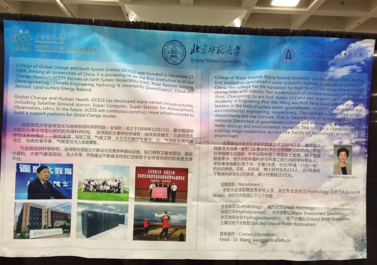2016年12月12日-16日,欧美无码 院长郝芳华教授、水文水资源系主任鱼京善教授以及2014级博士生田培和刘沙沙等共7名师生赴美国旧金山参加2016年美国地球物理学会的秋季年会(2016 AGU Fall Meeting),开展了学术交流、对外宣传和吸引人才等活动。