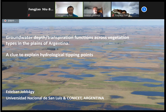Esteban Jobbágy教授的主要研究方向为土地利用变化对水循环和碳循环的影响,专注于南美的农业系统,重点研究全球粮食系统的不断变化对生态多样性的影响。自2003年以来,他在圣路易斯领导一个实验室,已撰写了190余篇科学文章、书籍章节等,同时他一直是IPCC土地和气候变化专栏的主要作者,并在近年来获得了AGU大使奖和TWAS奖。Esteban Jobbágy教授围绕“Groundwater depth/transpiration functions across vegetation types in the plains of Argentina: A clue to explain hydrological tipping points” 主题展开讲座,介绍了阿根廷中部平原随着大豆种植在草原和森林上的扩大,土地利用发生了极大的变化,进而引起了地下水位上升和洪水泛滥。同时,展示了不同植被类型将其蒸腾作用调节到地下水位和盐度梯度以及产生正向和负向生态水文反馈的过程。