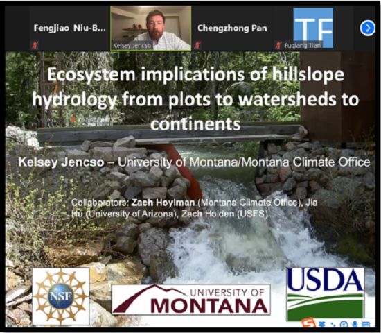 Kelsey Jencso教授是蒙大拿大学流域水文学副教授,也是蒙大拿州气候办公室主任。他目前的研究重点是流域水文学研究,以及使用水文测量、同位素示踪以及景观分析技术确定河流水源、流向等,他还十分重视模拟及预警技术的应用。同时,他还对河岸和山坡水文学以及流域水文过程的时空尺度进行了重点研究。Kelsey Jencso教授围绕“Scaling from trees, to forests to continents: The importance of hillslope hydrology for forest productivity and its sensitivity to climate” 主题展开讲座,介绍了在美国西部开展的研究,应用山坡和流域的多种方法,确定景观地形在缓冲生态系统对干旱年份和干旱增加的响应作用。在描述生态系统与气候之间的关系以及确定跨景观管理优先级时,这些对生态系统敏感性的分布式测量是重要的考虑因素。
