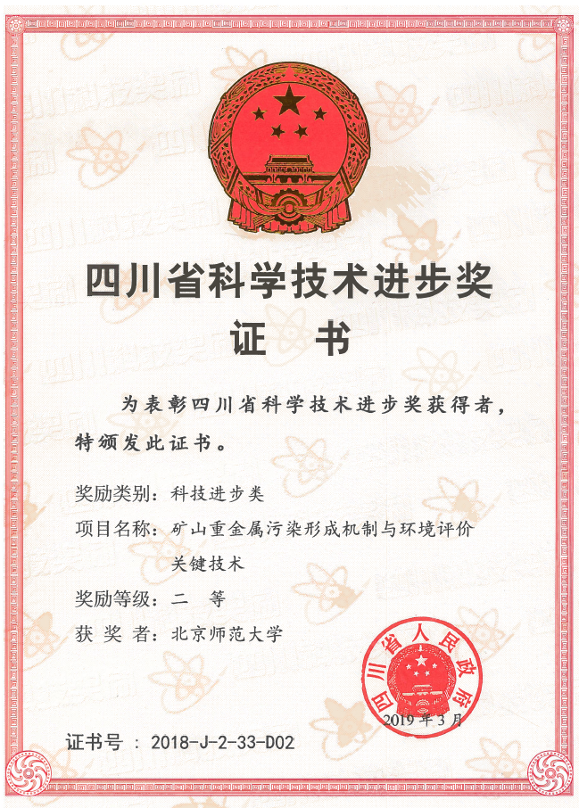 滕彦国教授、陈海洋副教授、杨洁讲师参加完成的“矿山重金属污染形成机制与环境评价关键技术”项目成果获得2018年四川省科学技术进步二等奖。