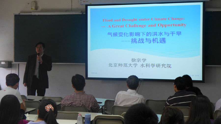 回京之前,徐宗学教授应淡江大学水资源及环境工程学系张丽秋主任邀请,赴淡江大学为该校师生近100人 做了"气候变化影响下的洪水与干旱:挑战与机遇”的学术报告,结合近年发生的重大干旱和洪涝灾害,介绍了当前国内外应对重大干旱洪涝灾害的战略对策和应对 措施,并对水文科学工作者所面临的机遇和挑战进行了分析与讨论。学术报告会后,该系相关教师十余人与徐宗学教授进行了单独交流与讨论,工学院院长何启东教 授单独会见了来访的徐宗学教授,宾主双方就未来两校、两院在相关领域的交流与合作进行了广泛的讨论,相互交流了关于今后加强学术交流与合作的意见与看法。
