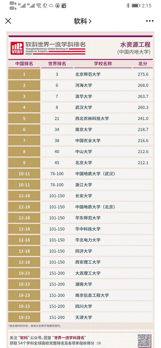 近日,上海软科公布了2020软科世界一流学科排名,我校在水资源工程学科排名中,位列中国第一名、世界第三名。