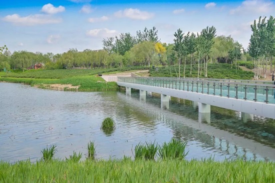 2021年4月,北京亦庄,因形似日月而得名的通明湖公园,是亦庄经济开发区路东区最大的景观湿地。 (视觉中国/图)